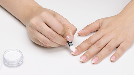Then immediately use the included applicator brush to apply the pearl powder onto your freshly-cured manicure. Use good pressure to rub the powder until it's completely smooth and shiny.